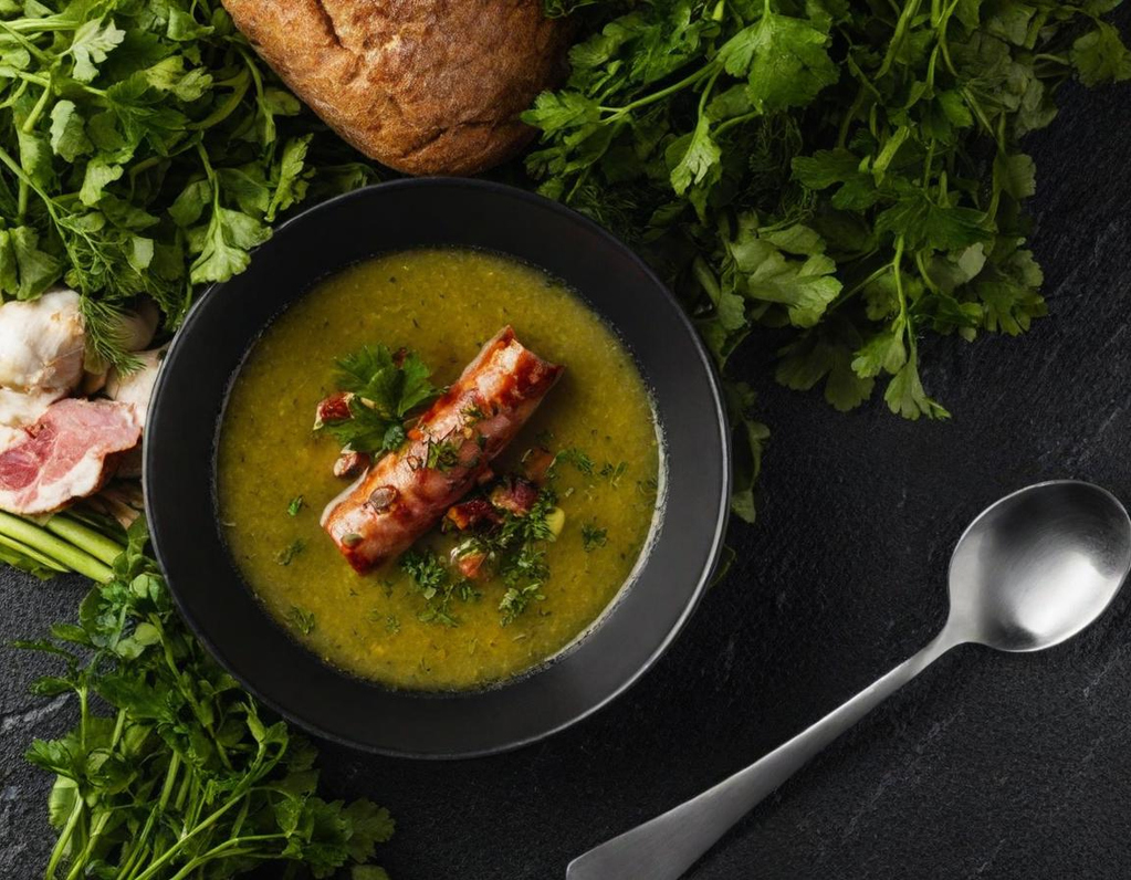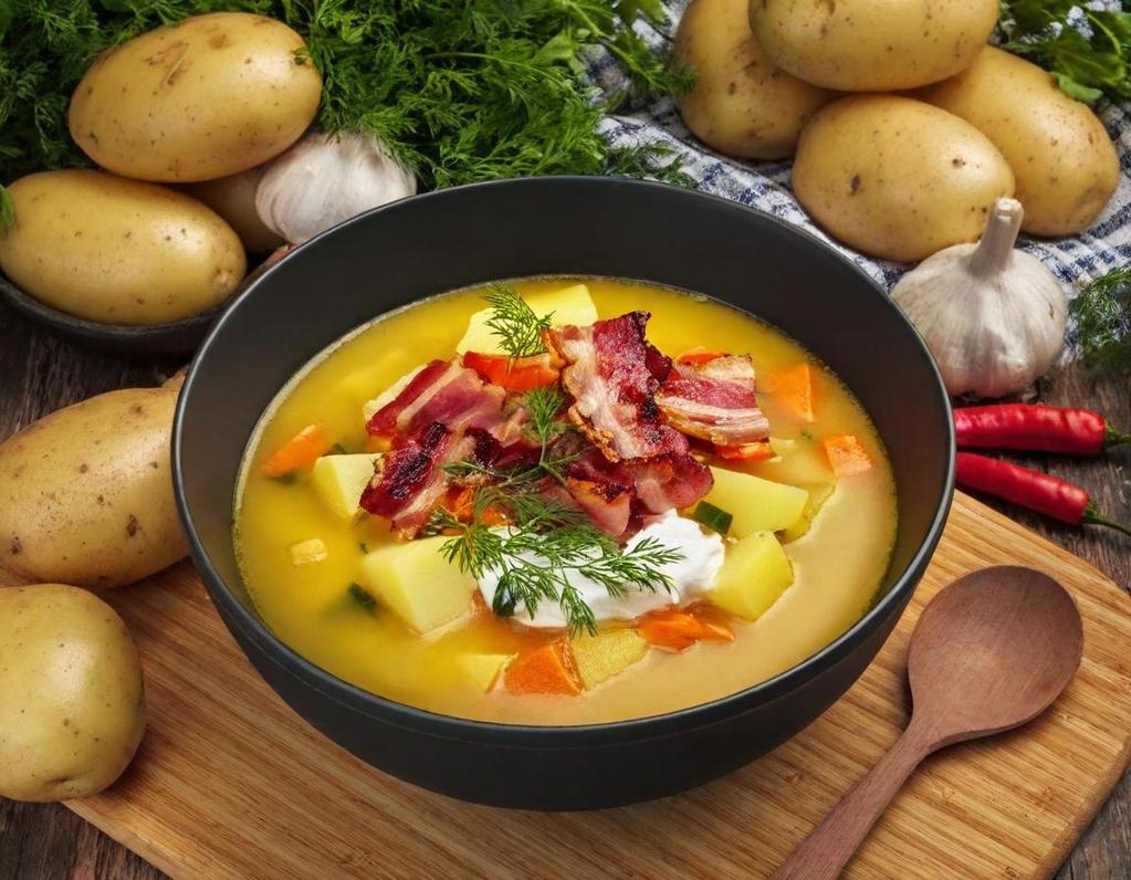 Rustikale Kartoffelsuppe mit Rauchspeck und Knacker mit Bauernbrot